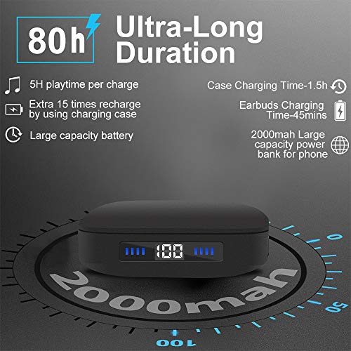 【80h Wiedergabezeit mit tragbarem Ladecase】: Die ultrahohe Kapazität von 2000mAh des Ladecases gewährleisten 80+ Stunden Wiedergabezeit. Die Kopfhörer lassen sich 15 mal mit dem Ladecase aufladen und haben bei voller Ladung eine Wiedergabezeit von 5,5 Stunden. In 1,5 Stunden ist das Ladecase voll aufgeladen, die Kopfhörer im Ladecase werden innerhalb von 45 Minuten voll aufgeladen. Das Ladecase kann zusätzlich als Powerbank verwendet werden um Smartphones, sowie andere Geräte zu laden. Somit is