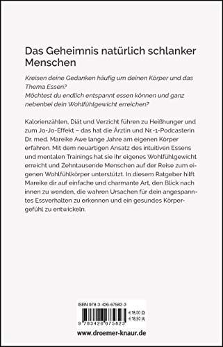 Mit Genuss essen, rundum wohlfühlen und nebenbei dein Wohlfühlgewicht erreichen mit der Expertin Dr. Mareike Awe.Kalorienzählen, Verzicht und Diäten führen langfristig zu Übergewicht und Unzufriedenheit. Wir quälen uns durch immer neue Fitness- und Diät-Trends, um ein körperliches Ideal zu erreichen. Am Ende bekommen wir allerdings das Gegenteil: immer neue Frustkilos und das ungute Gefühl, versagt zu haben.Dr. Mareike Awe kennt all dies nur zu gut aus ihrer eigenen Vergangenheit. In ihrem Buch unterstützt sie dich deshalb dabei, deinem Körper wieder zu vertrauen und somit unbeschwert und langfristig zu deiner Wohlfühlfigur zu finden.Du erfährst die Gründe, weshalb Diäten nicht funktionieren und lernst das Geheimnis der Menschen kennen, die auf nichts verzichten müssen und trotzdem schlank sind. Mit Hilfe der vier Grundsätze des intuitiven Essens und zahlreichen Übungen zur Selbstreflexion, erfährst du, wie du ohne schlechtes Gewissen dein Essen genießt und dich von deinem Heißhunger und Gelüsten befreist. Der Schlüssel zum Erfolg ist dabei nicht das, was du isst, sondern deine innere Einstellung und deine unbewussten Gewohnheiten, die den entscheidenden und langfristigen Unterschied machen.Mit mentalem Training deckst du deine Glaubenssätze rund um dein Selbstbild und deinen Körper auf, die dich heute noch daran hindern, dass du voller Selbstvertrauen in den Spiegel schaust. Wohlfühlen ist die Grundlage für dein Wohlfühlgewicht und nicht die Folge davon.Dr. Mareike Awe nimmt dich in vielen emotionalen Geschichten aus ihrem eigenen Leben mit auf die Reise zu deinem persönlichen Wohlfühlgewicht und erklärt dir Schritt für Schritt, was sie bisher an sich selbst und über 15.000 Programmteilnehmern erfolgserprobt hat.In diesem Buch erfährst du:- die Gründe, weshalb Diäten und Hungern nicht funktionieren- das Geheimnis der Menschen, die auf nichts verzichten müssen und trotzdem schlank sind- wie du neue Essgewohnheiten in deinen speziellen Alltag integrieren kannst.